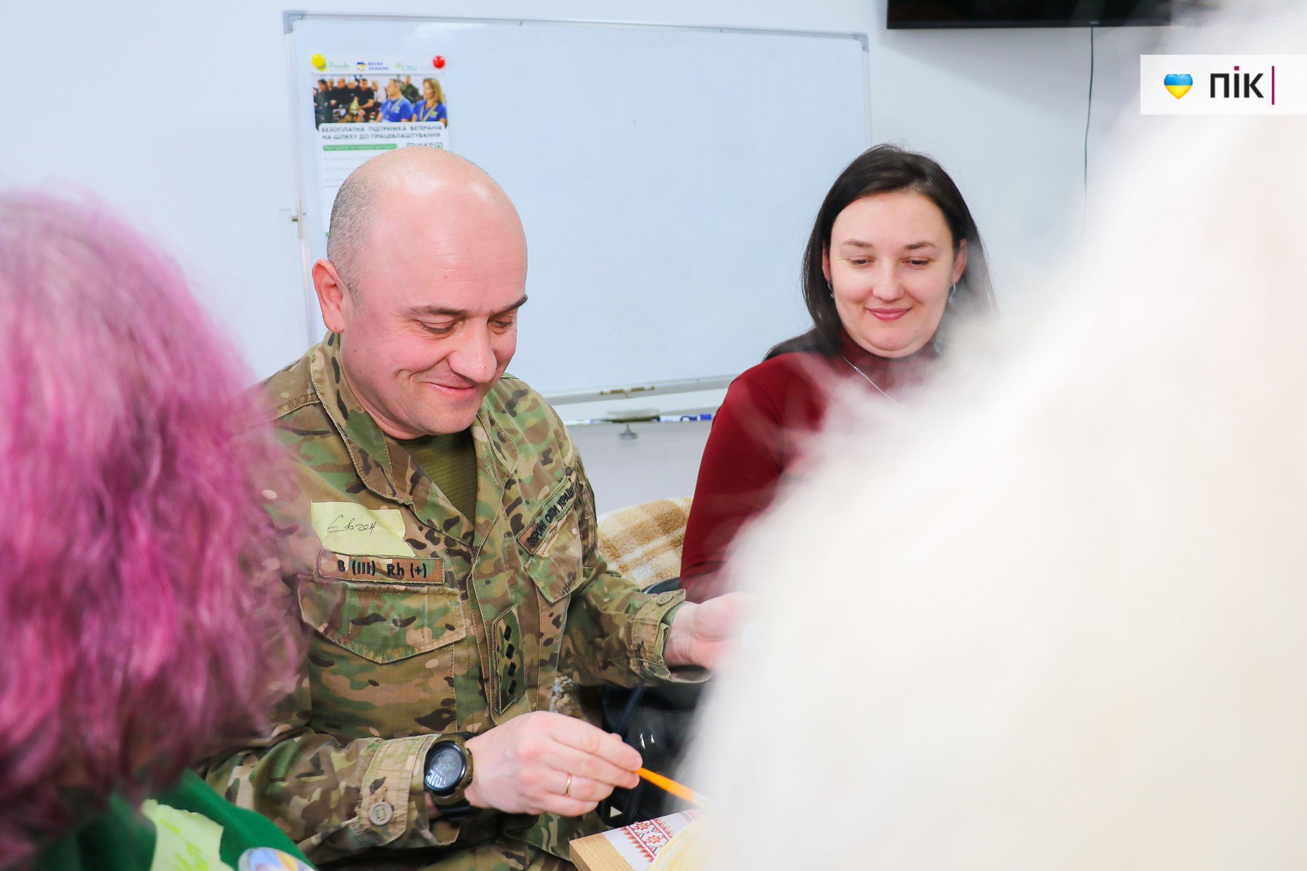 Сьогодні вдалося до майстер-класу долучитися і військовослужбовцю Євгену. Каже, що творчість допомагає впоратися зі стресом після пережитого на війні. Разом з іншими учасниками він малював дерева — як символ сили, надії, стійкості та відродження.