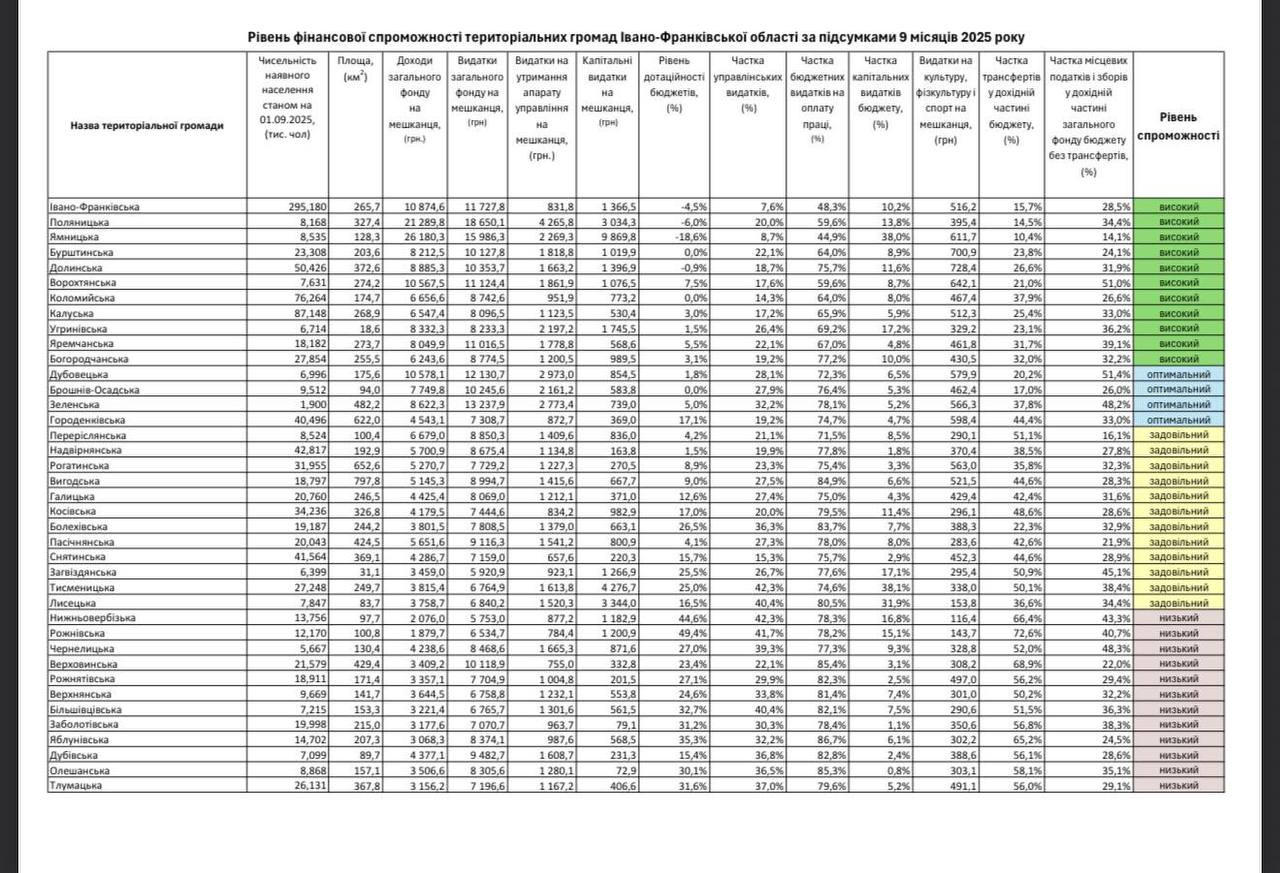 За дев’ять місяців 2025 року високий рівень фінансової спроможності отримали 12 територіальних громад Івано-Франківської області: