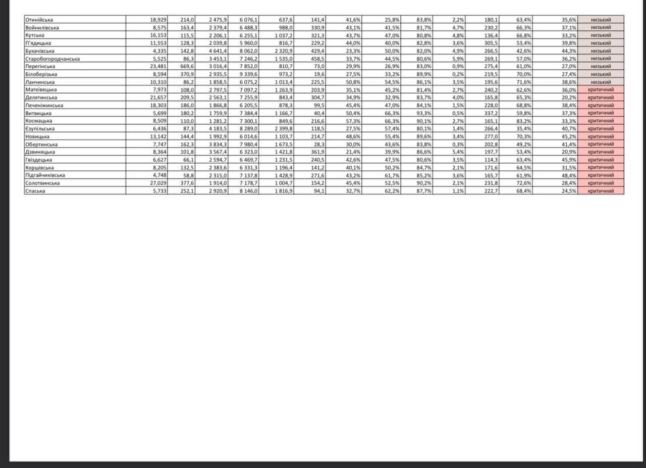 Ще 102 громади в Україні віднесли до категорії з критичним рівнем. Найбільше їх у Чернівецькій області (19). На Прикарпатті до цієї категорії потрапили 14 громад.