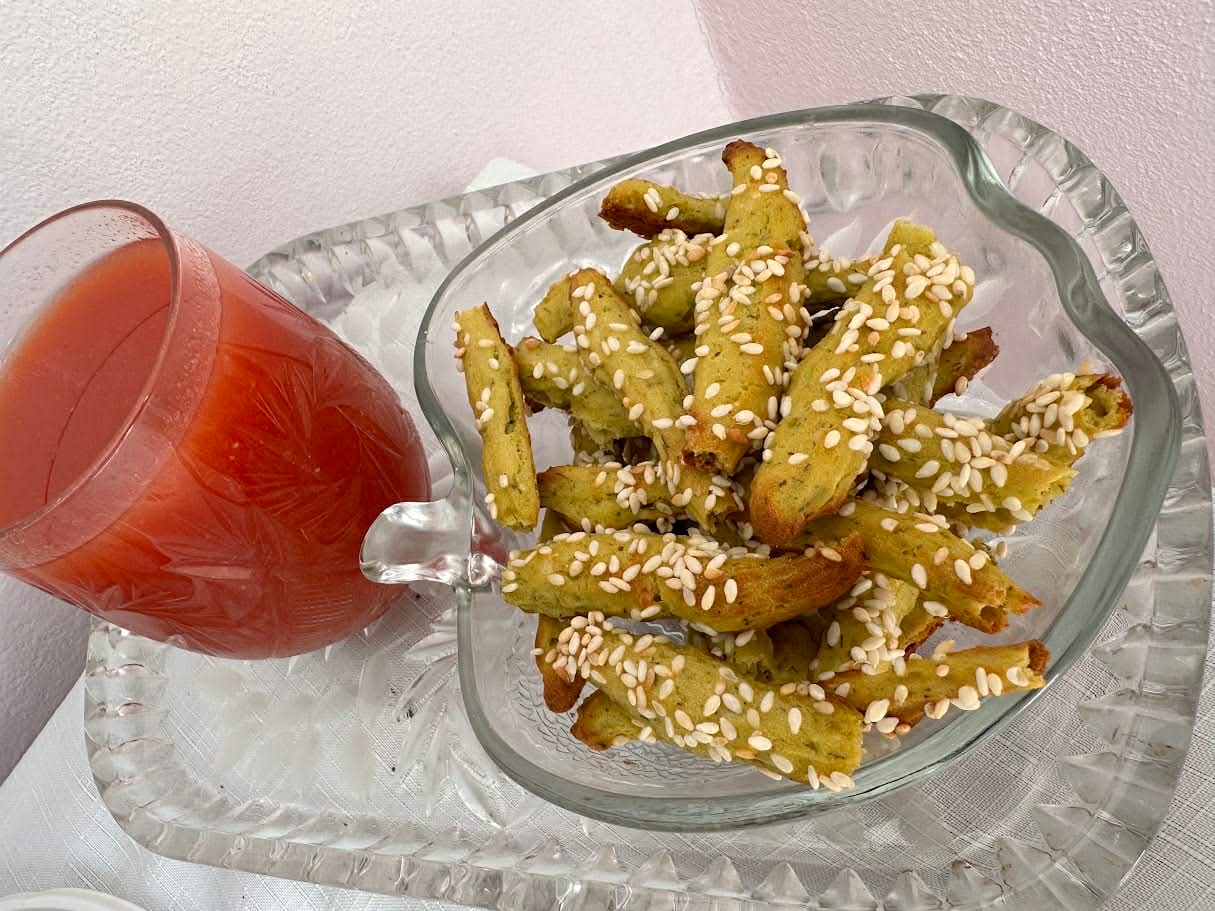 За подібним рецептом випікаємо пряні горохові палички. До пюре додаємо борошна та соку з цибулі. Витискаємо через насадку палички на пергамент і посипаємо їх кунжутом. Випікаємо протягом 5-7 хвилин. Такі вироби нагадують сухарики і смакують із томатним соком.