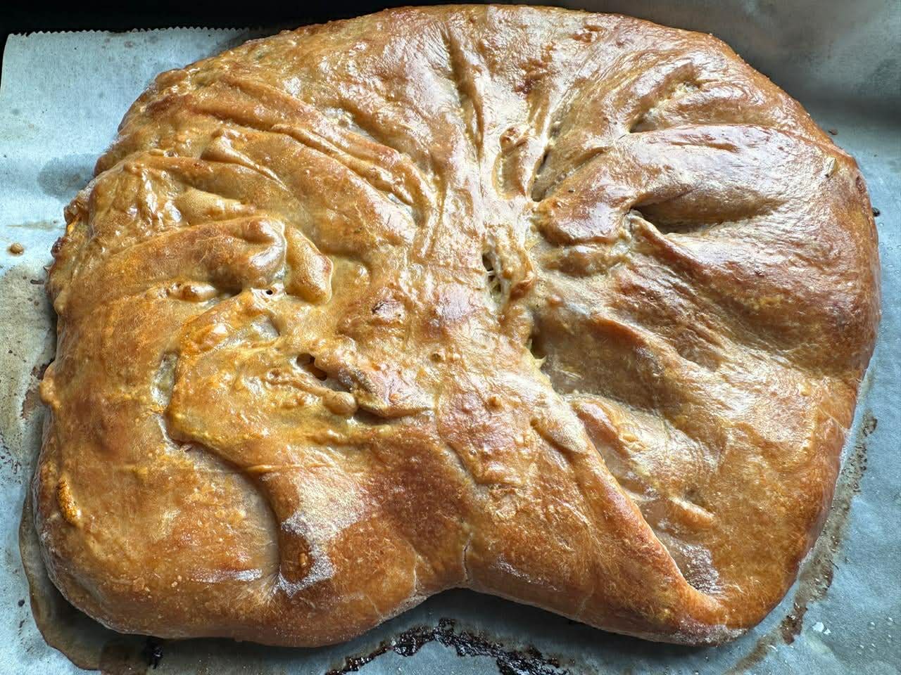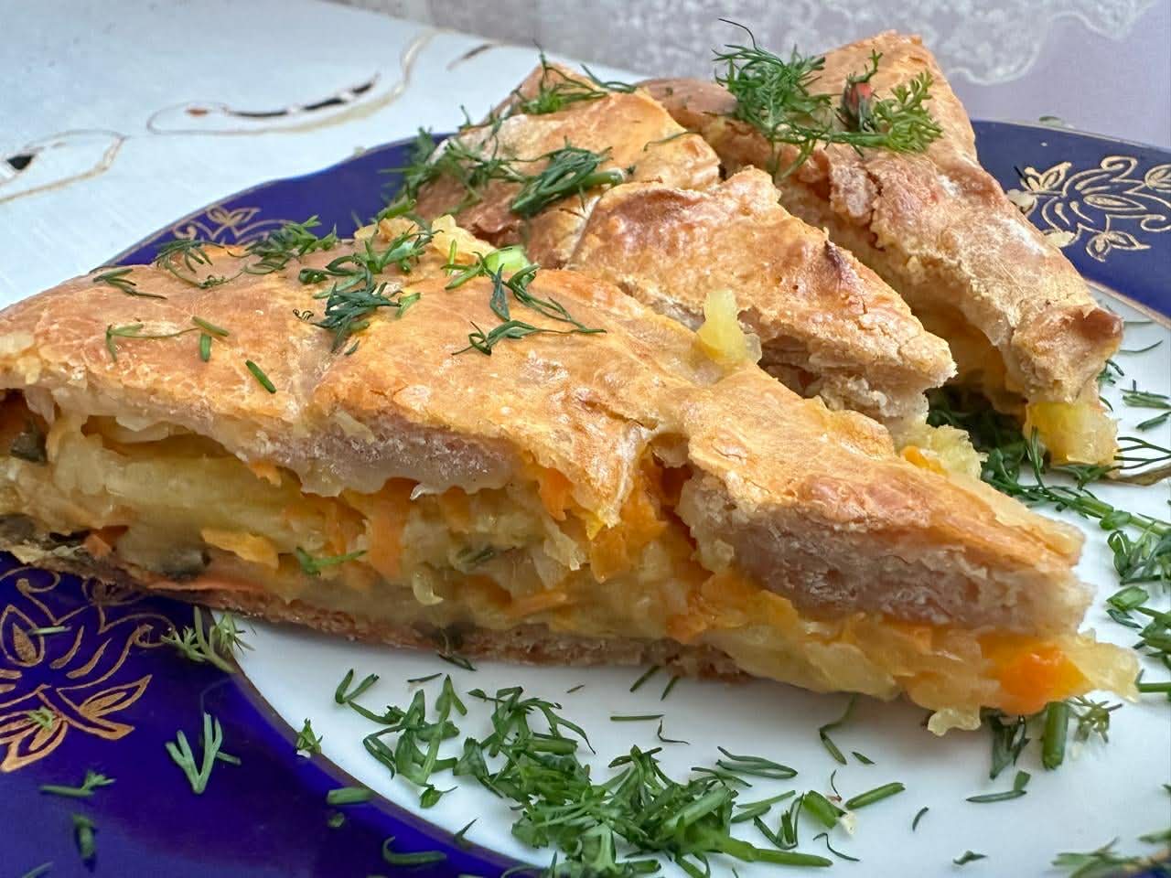 Підготовлене пюре слугує основою для горохового пирога. До начинки додаємо смаженої моркви та цибулі. Викладаємо на будь-яке заздалегідь розкатане тісто – або таке, як на вареники, або на основі кефіру та розпушувача. Краї загортаємо до середини і защипуємо. Змащуємо яйцем або водою. Можна посипати кунжутом. Викладаємо на змащений олією пергамент і запікаємо протягом 30 хвилин.