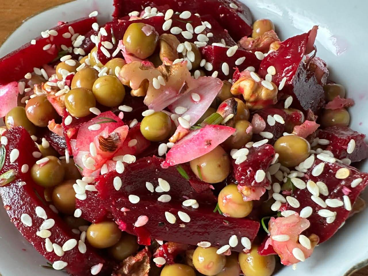 Салат із консервованого горошку можна готувати з будь-якими овочами. Наприклад, із нашаткованим вареним чи консервованим буряком та цибулею. Збагачуємо його підсмаженими горіхами та заправляємо сумішшю олії, лимонного соку або оцту, подрібненого часнику та гірчиці. Смак можна покращити чорносливом, яблуками або зеленню, заправляючи салат медово-гірчичним соусом.