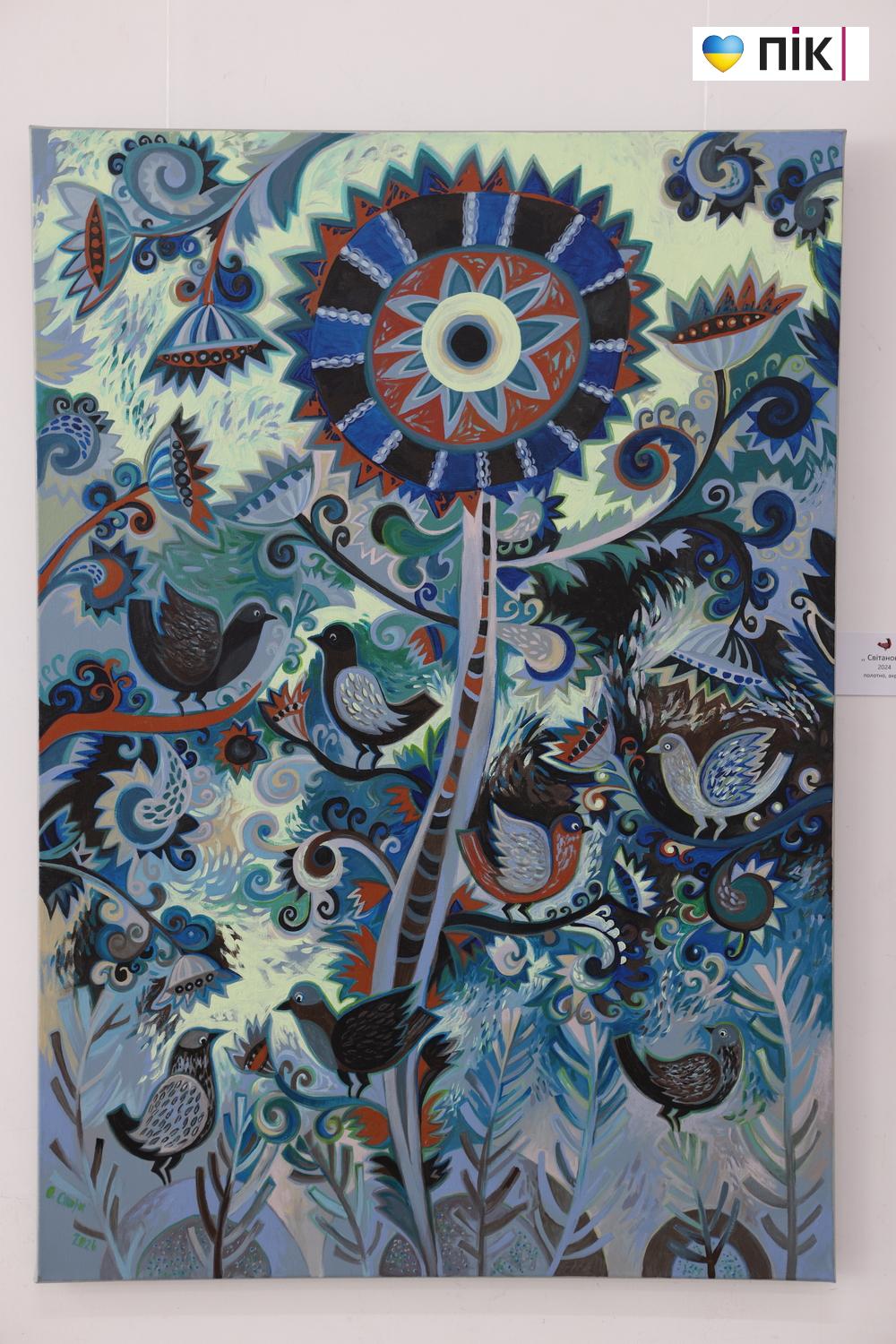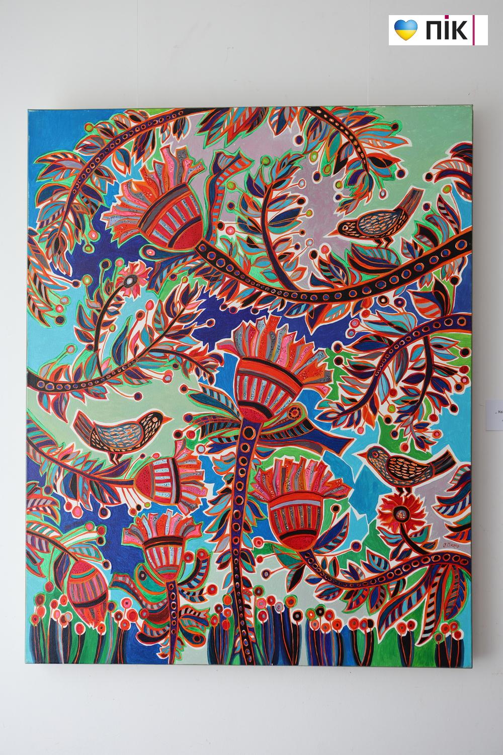 Художниця використовує насичену палітру — ультрамарин, смарагдові та вогняно-помаранчеві кольори, створюючи ефект внутрішнього світіння. Чіткий контур і графічна виразність надають образам птахів і квітів особливої сили та впізнаваності.